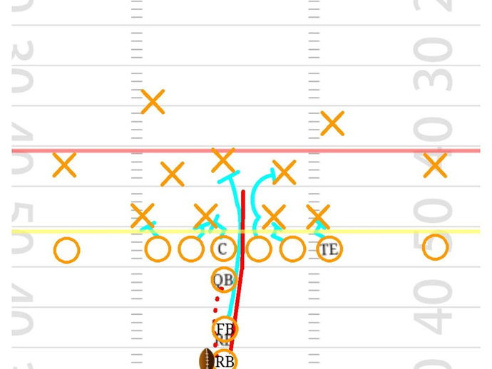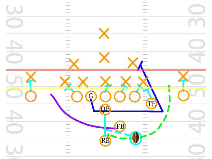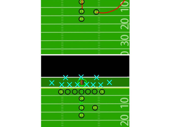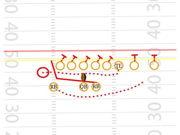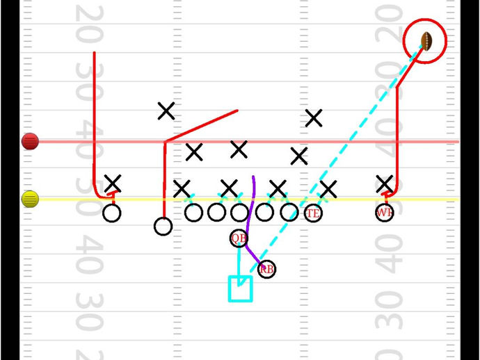 Running back pass to the boundary with pre snap shift. Vs split field coverage